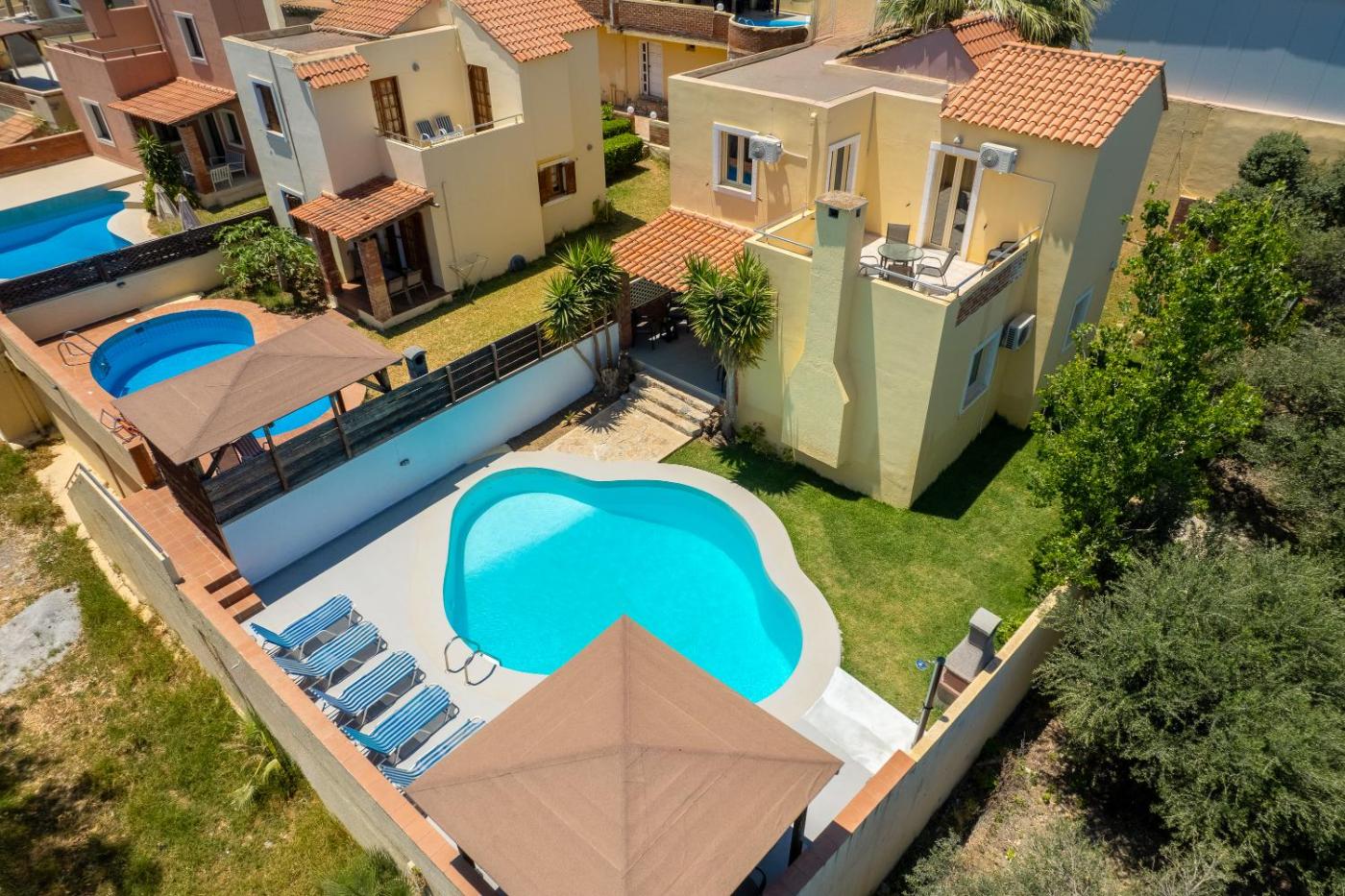 Three-Bedroom Villa. This luxurious villa has a pool with a view, a hot tub and a fireplace. Boasting a private entrance, this air-conditioned villa features 1 living room, 3 separate bedrooms and 2 bathrooms with a walk-in shower and a hairdryer. Guests will find a stovetop, a refrigerator, kitchenware and an oven in the well-equipped kitchen. The villa also comes with a barbecue. Featuring a terrace with sea views, this villa also features a washing machine and a flat-screen TV with streaming services. The unit has 10 beds. ;