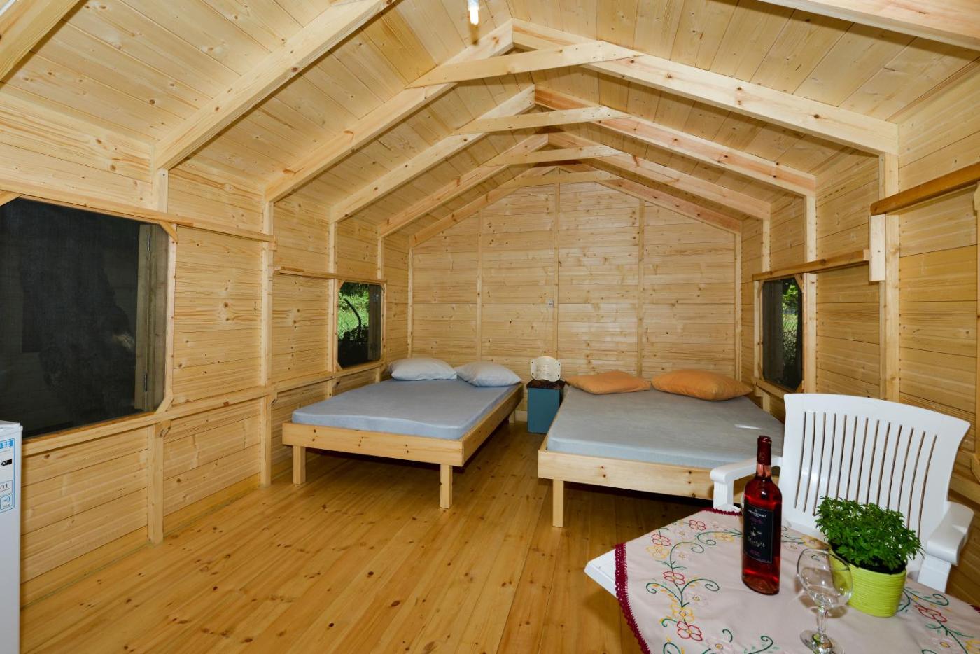 Wooden Family Tent (4 Adults). This wooden tent has a kitchenware and patio.