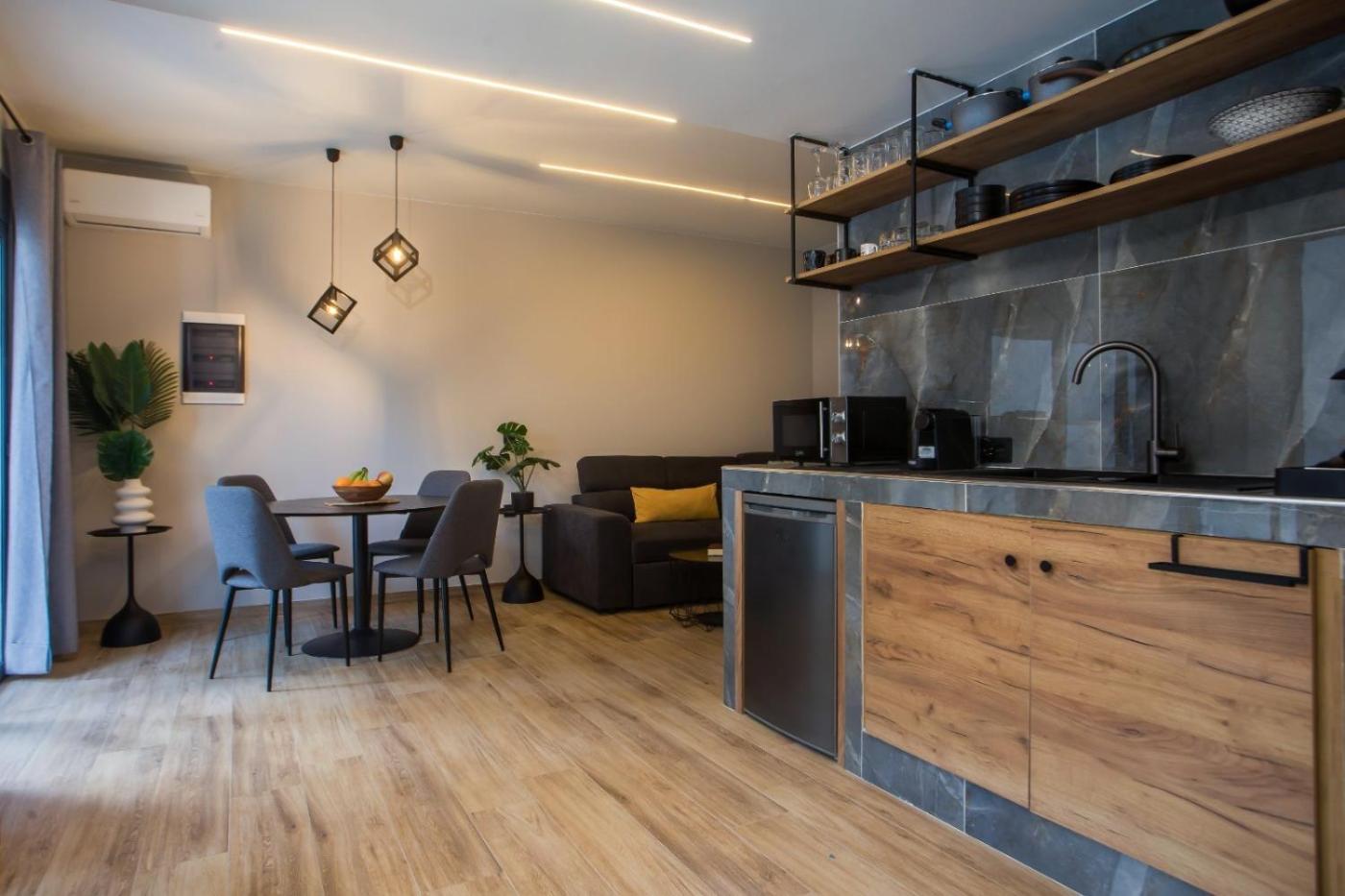 One-Bedroom Apartment. The hot tub is a top feature of this apartment. Guests can make meals in the kitchen that features a stovetop, a refrigerator, kitchenware and an oven. This apartment is air-conditioned and has a seating area with a flat-screen TV, a washing machine, a private entrance, a coffee machine, as well as a dining area. The unit has 2 beds.